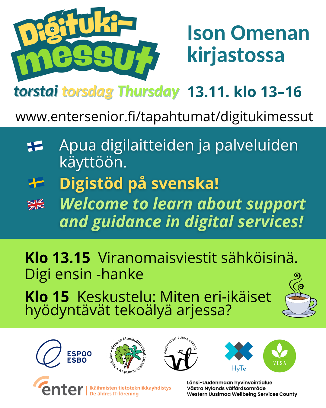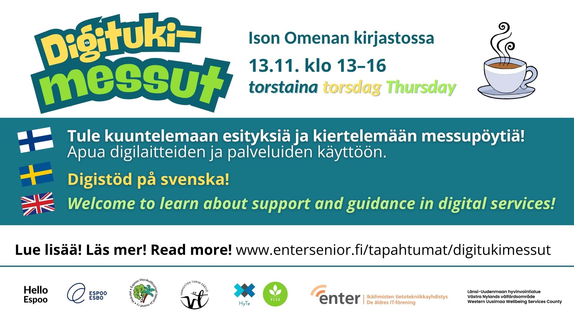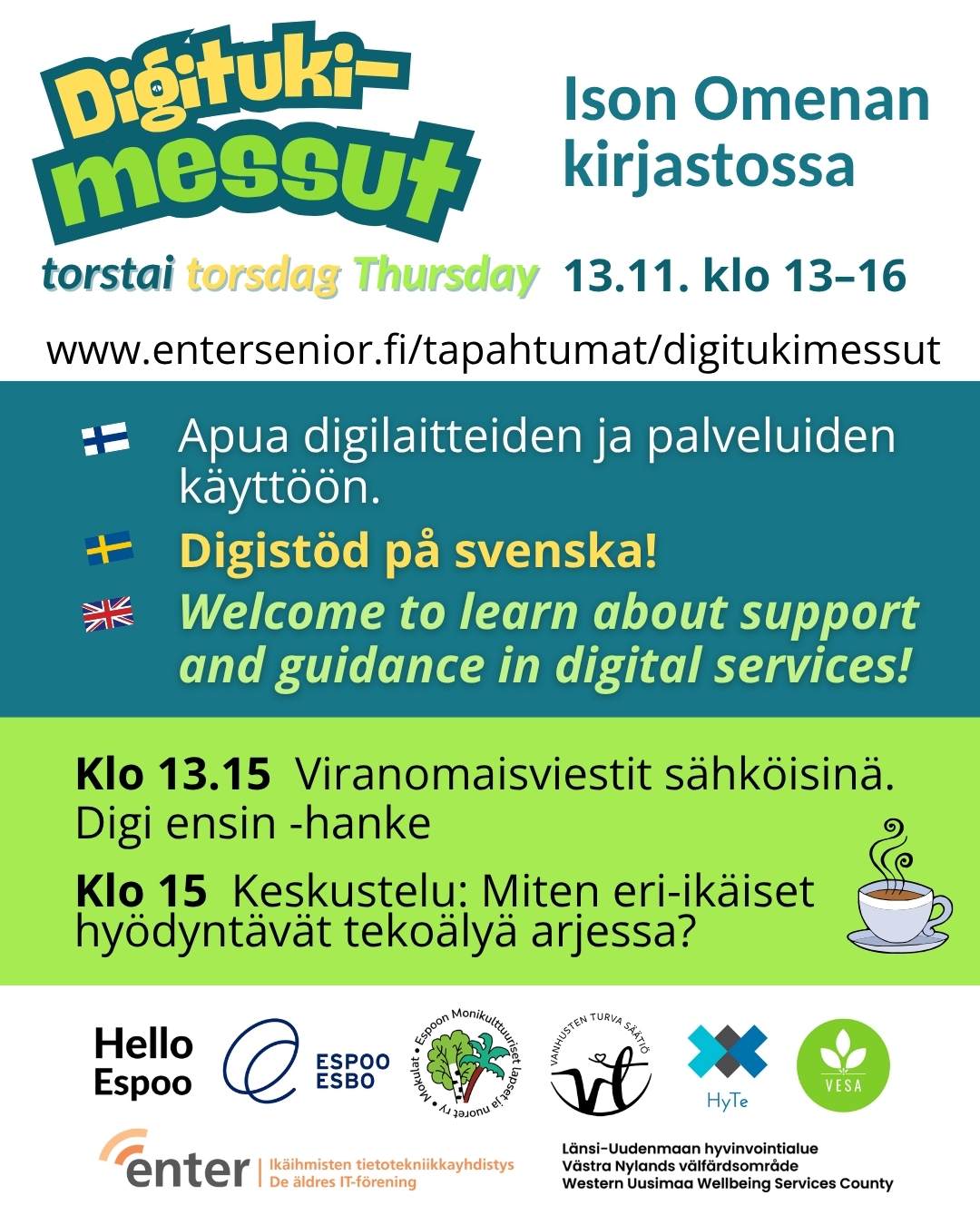 Järjestäjinä yhteistyössä Enter ry, Espoon kaupungin digituki, Länsi-Uudenmaan hyvinvointialue LUVN ja Ison Omenan kirjasto.