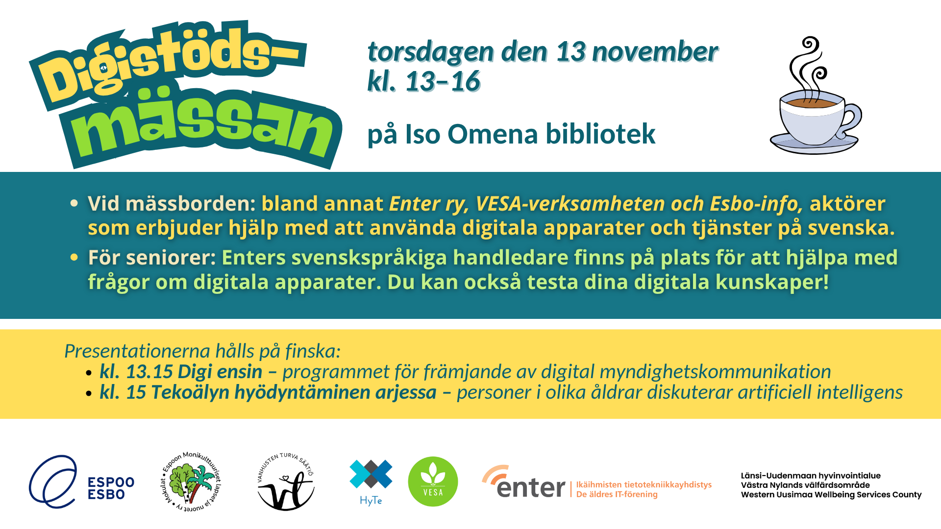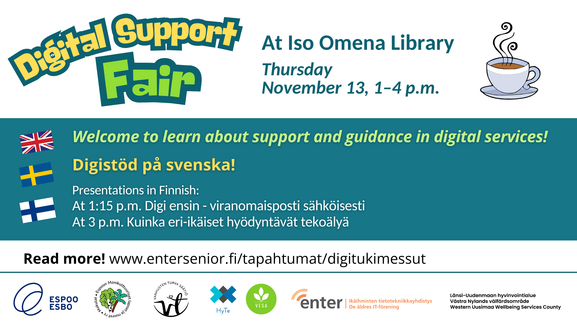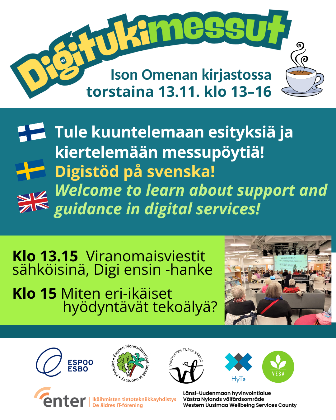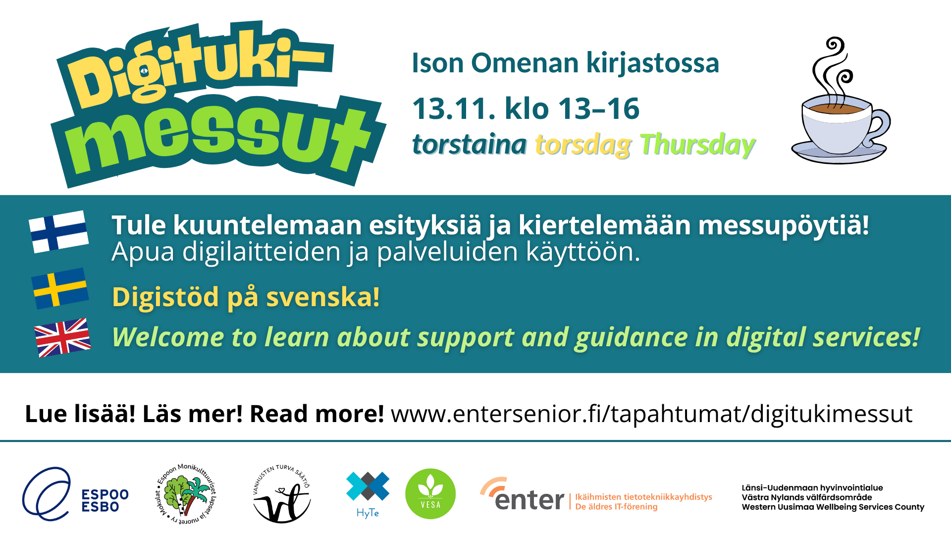 Järjestäjinä yhteistyössä Enter ry, Espoon kaupungin digituki, Länsi-Uudenmaan hyvinvointialue LUVN ja Ison Omenan kirjasto.