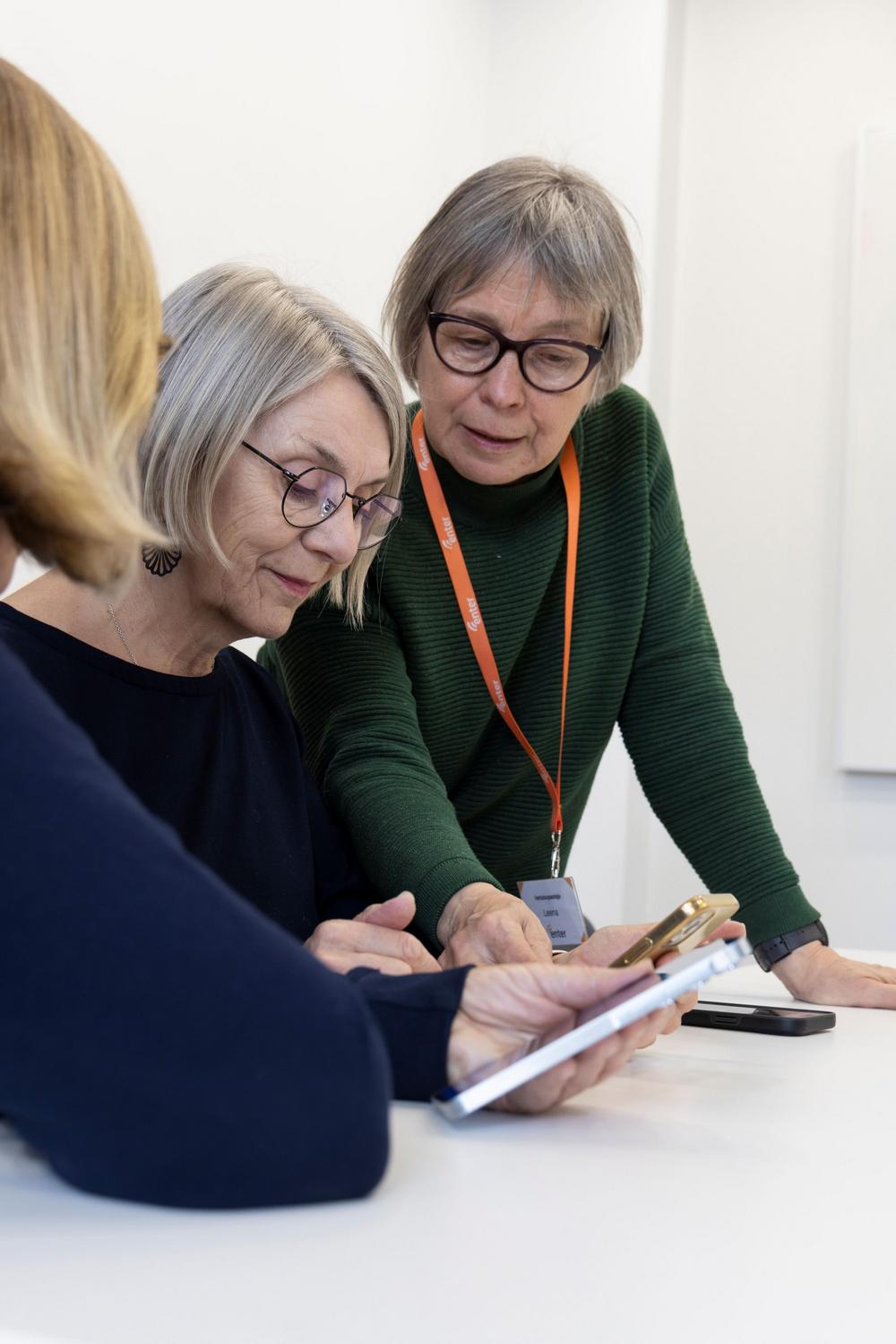 Vapaaehtoiset digiopastajat neuvovat asiakkaita puhelimien, tietokoneiden ja tablettien käytössä. Kaipaisimmekin lisää vapaaehtoisia heille digiopastajakavereiksi opastuksiin.